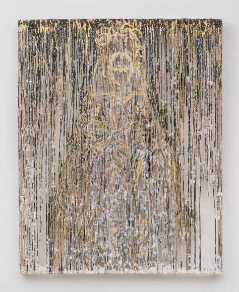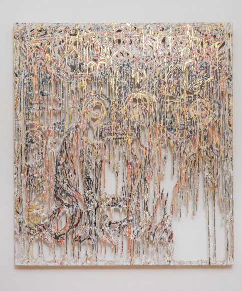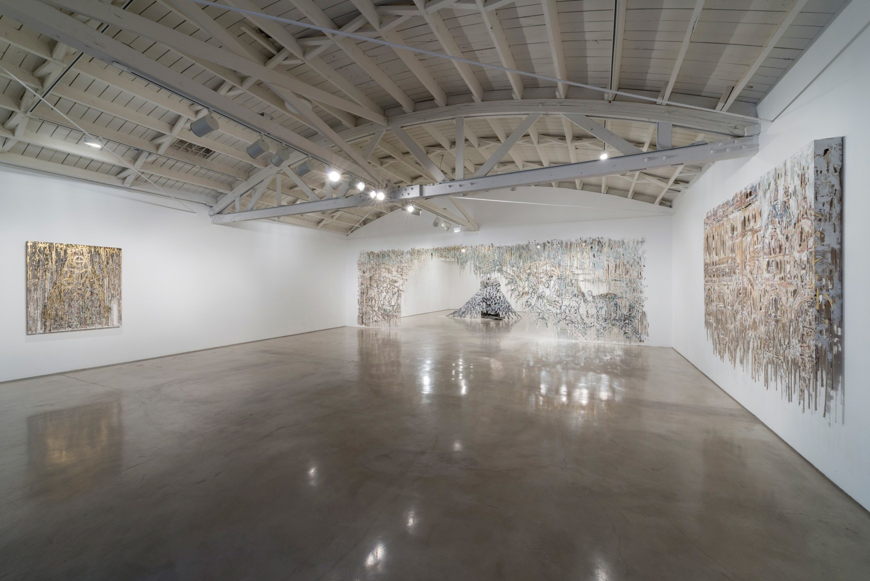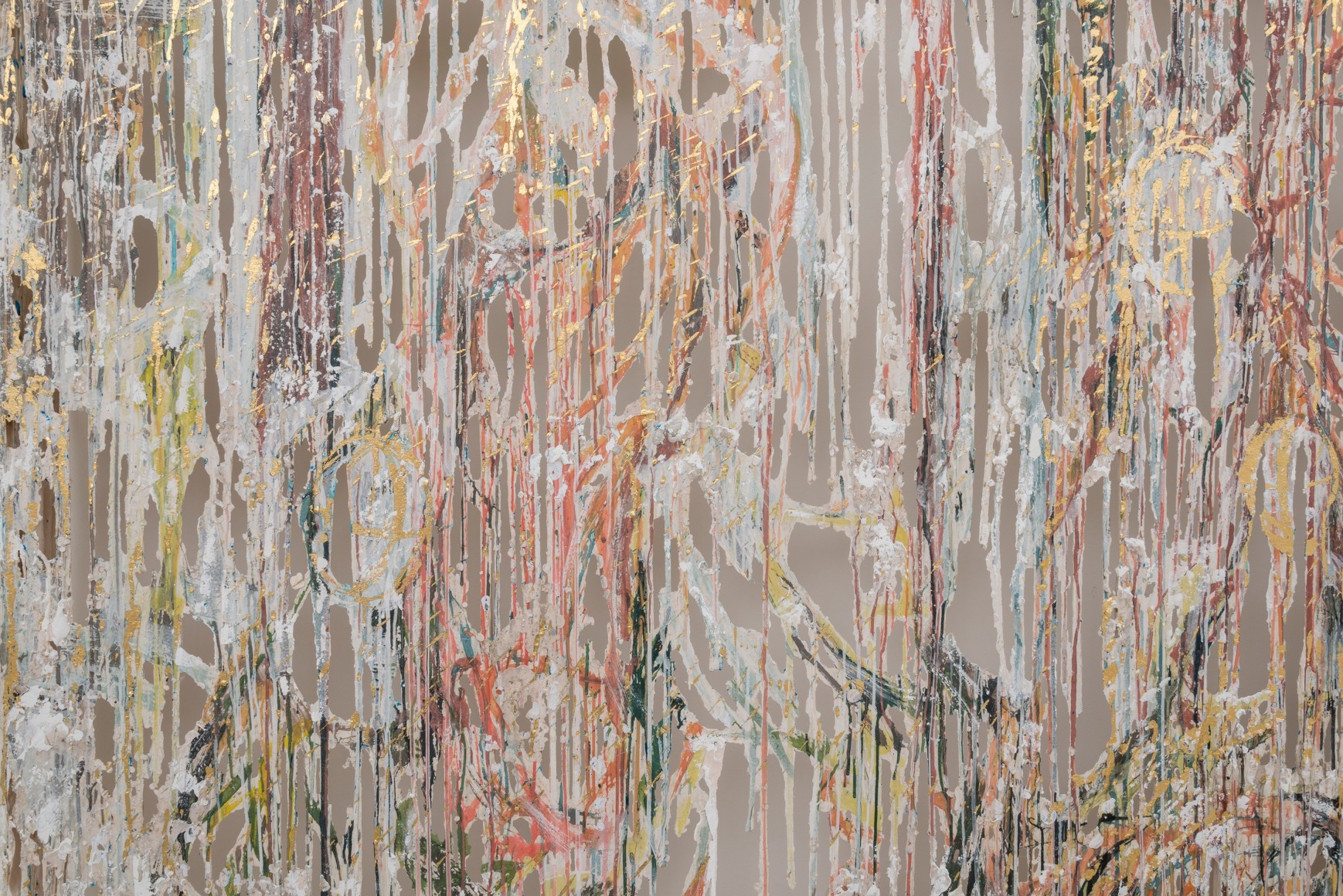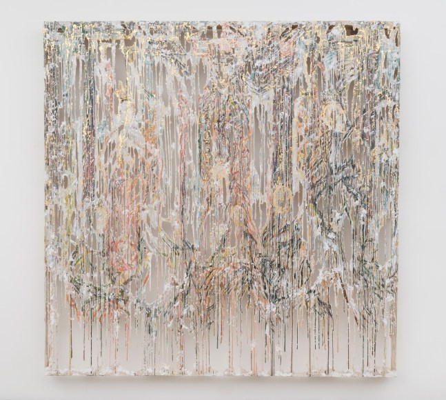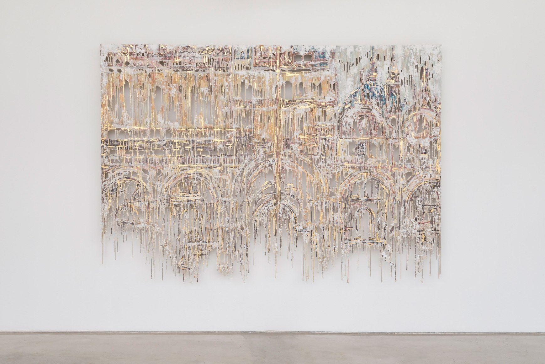 Large-scale panels merge image and volume. These lace-like works, formed using an additive process combining polymer gypsum, fiberglass, and plaster, held together by a skeleton of steel, finally manifest as apparitional paintings. On the surface of each piece, gold leafing drips along lines and contours, highlighting the collapse of image, and exalting memory against the inevitable passage of time. One of the panels is influenced by a snapshot taken at Piazza San Marco that Al-Hadid captured during her last trip there, when the façade of the cathedral was mostly covered in scaffolding. The bottom of this piece is open, so that the building’s semi-discernable architectural form disintegrates out of the “frame.”