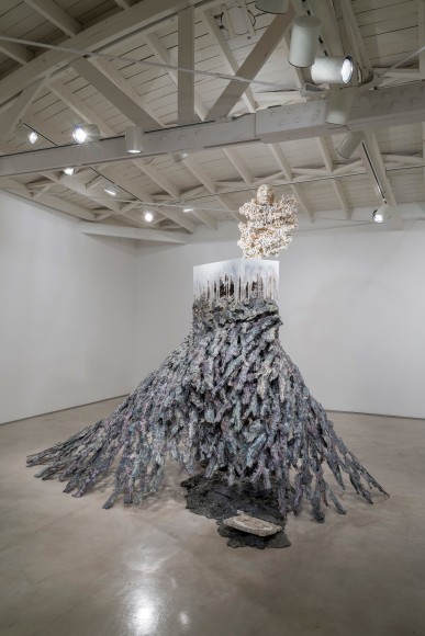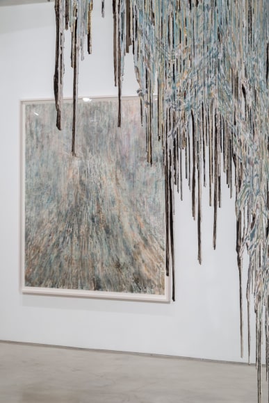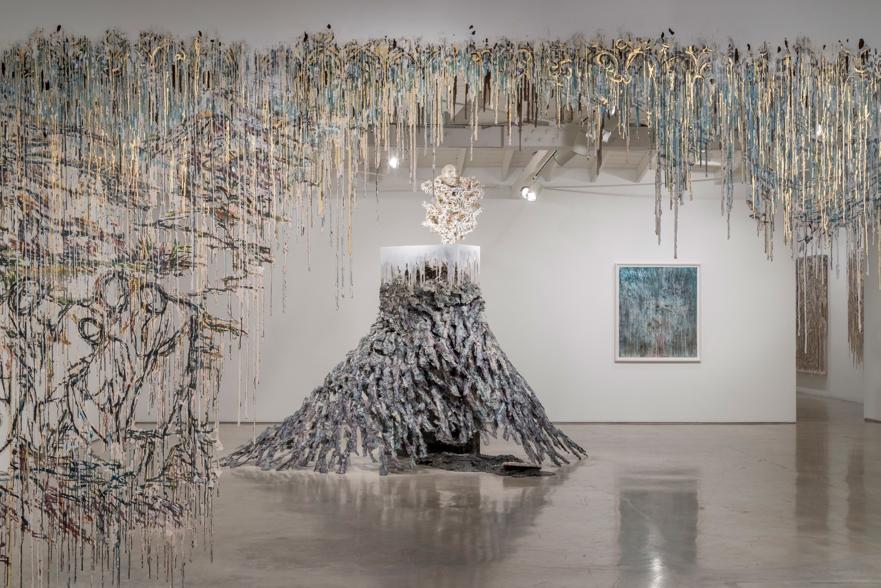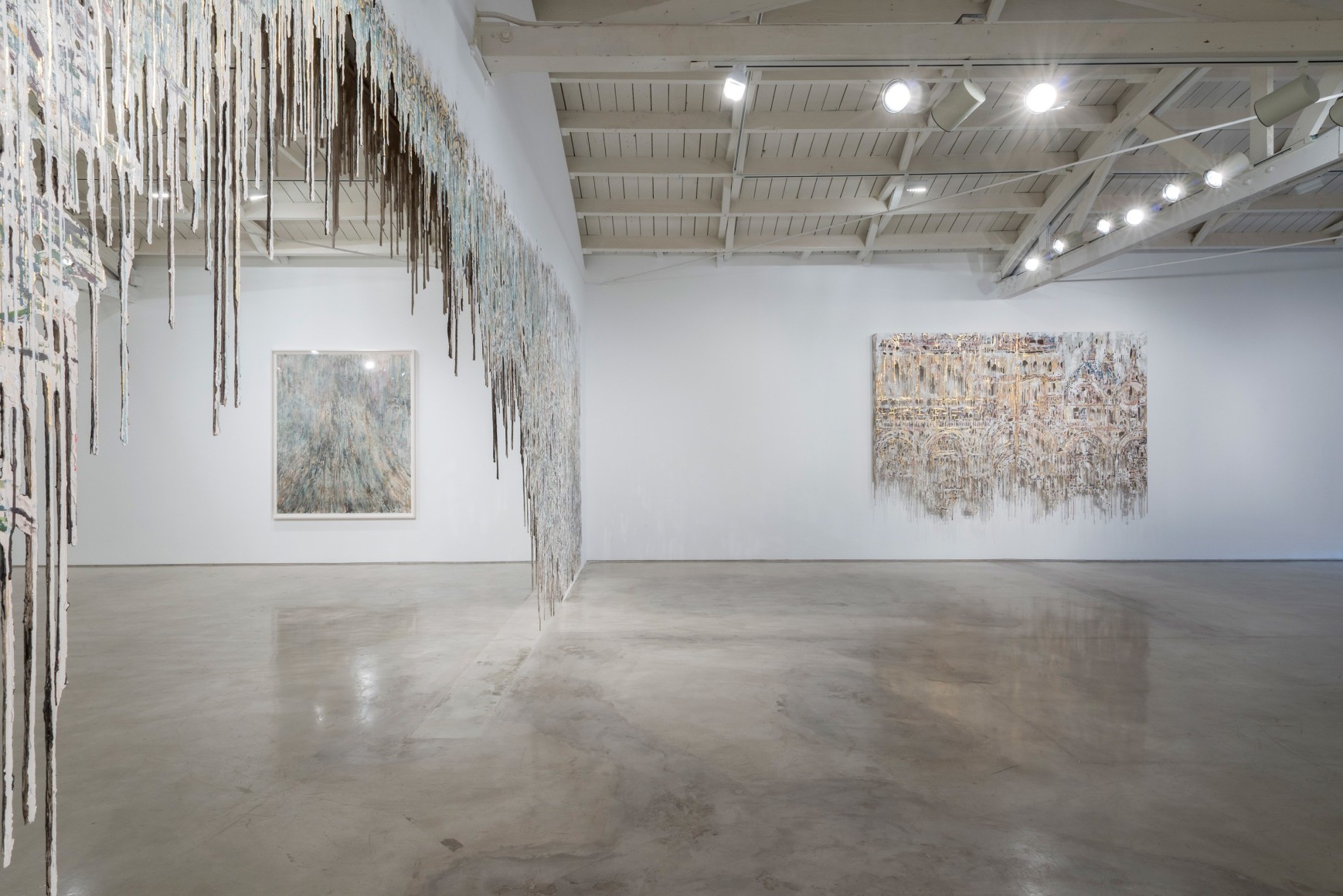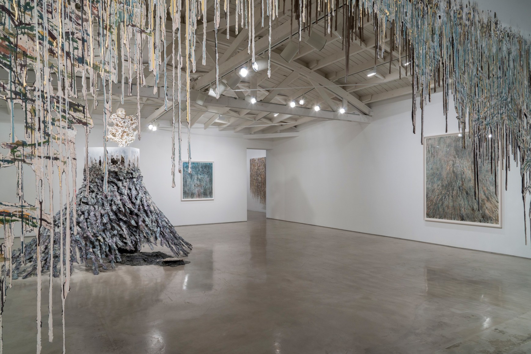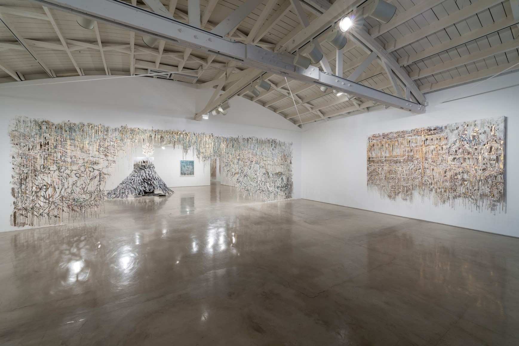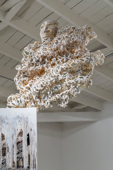 Al-Hadid created an installation specifically for this exhibition, applying a bottomless design, similar to the San Marco piece. This exploit drops a 30-foot long “wall” from the ceiling, spanning the width of the gallery space. Combining landscape and portrait imagery from various Old Master paintings, she constructed this to include a sizable egress, irregular and fissured, allowing people to move through the work. Inviting interaction, this installation is the first of its kind, giving the sense of traversing a painting, or passing through a threshold between a distant past and an obscure frontier.