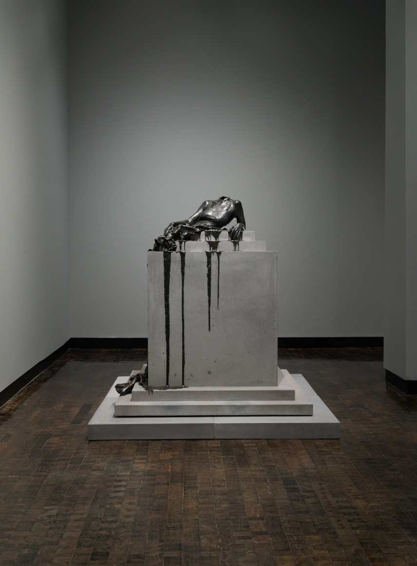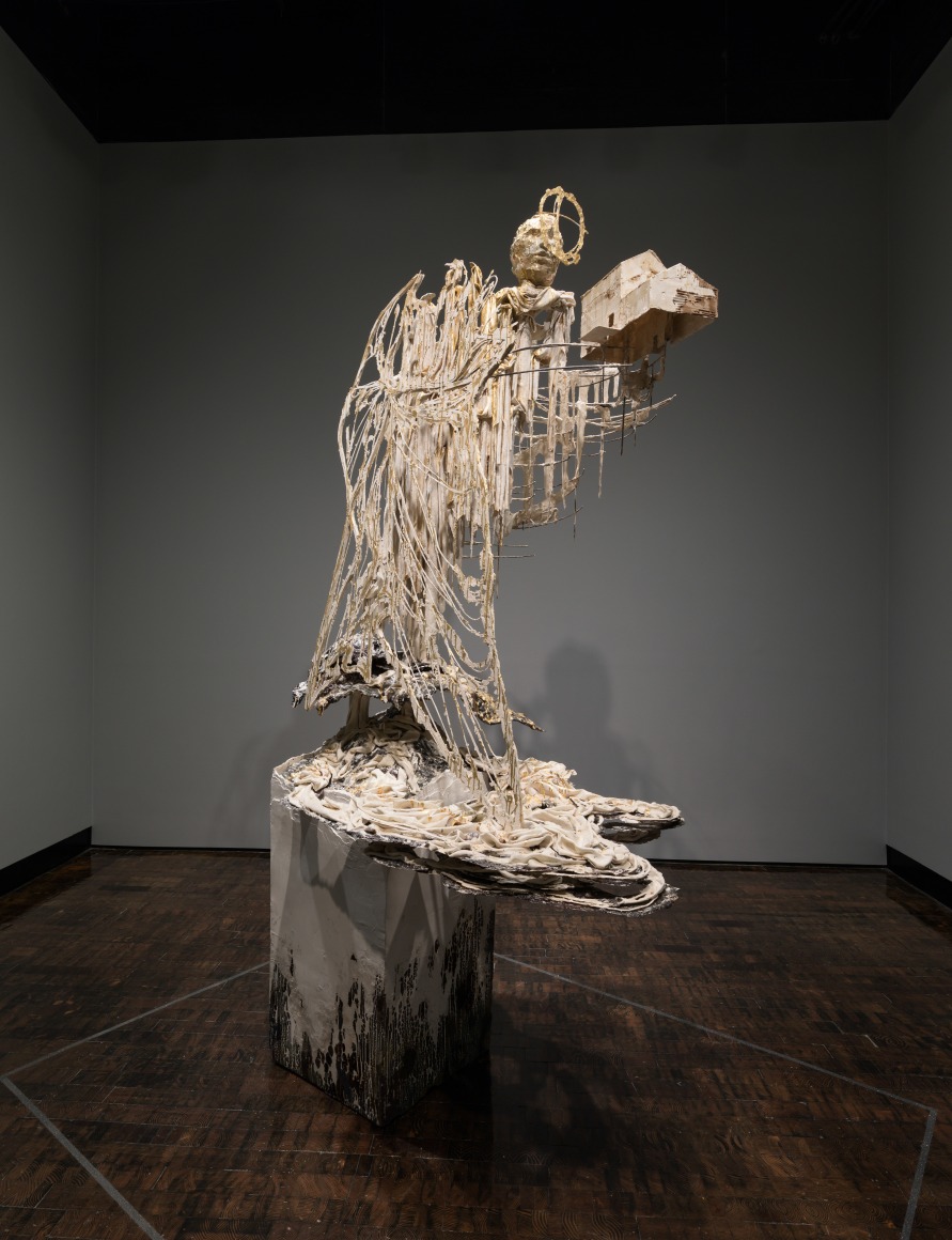 Other works show the body in decay or disintegration. “Head in the Clouds at the Frist is a skeletal wraith, haloed like a saint and winged like an angel, who holds in her extended hand a model of Al-Hadid’s childhood home,” writes Scala. “While there are precedents of saints holding churches out as offerings to Christ, this recasts the tradition, asking what and where is home and what must be sacrificed in exchange for entering the larger world, questions more acute, perhaps, for the immigrant than the native born.” As in Al-Hadid’s other work, Head in the Clouds occupies the intersection of collapse and tensile strength, loss and renewal, decay and growth.