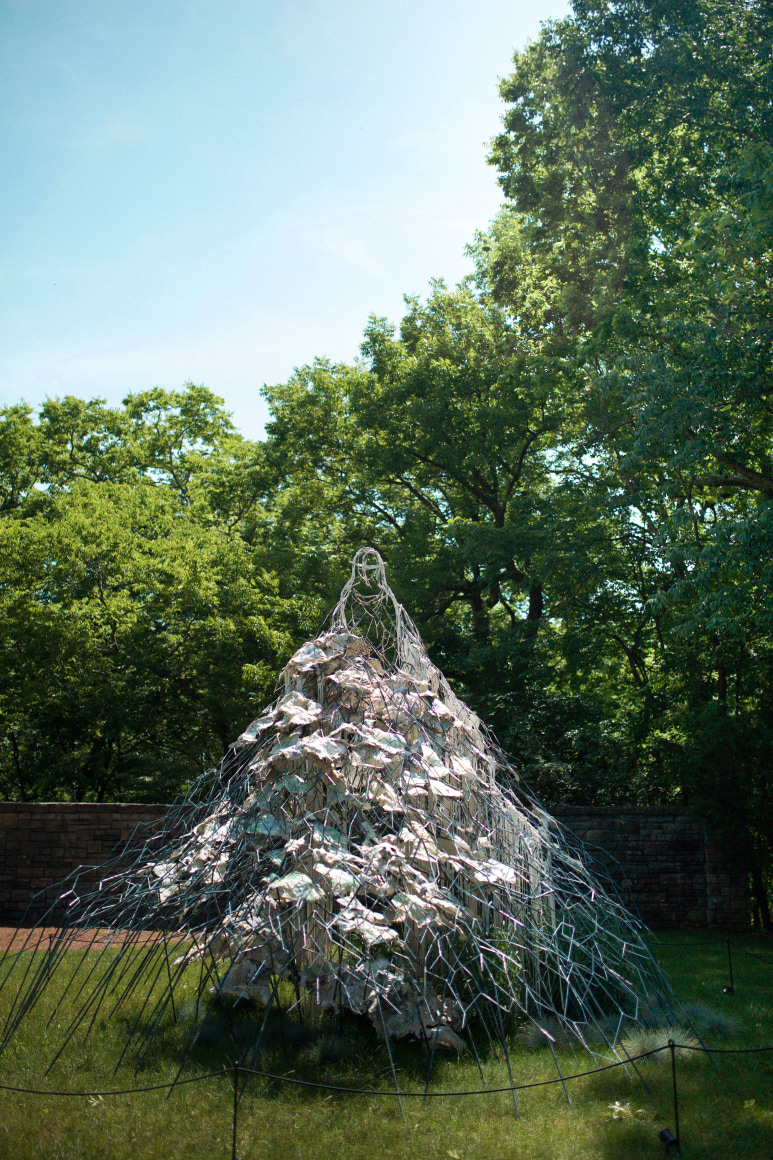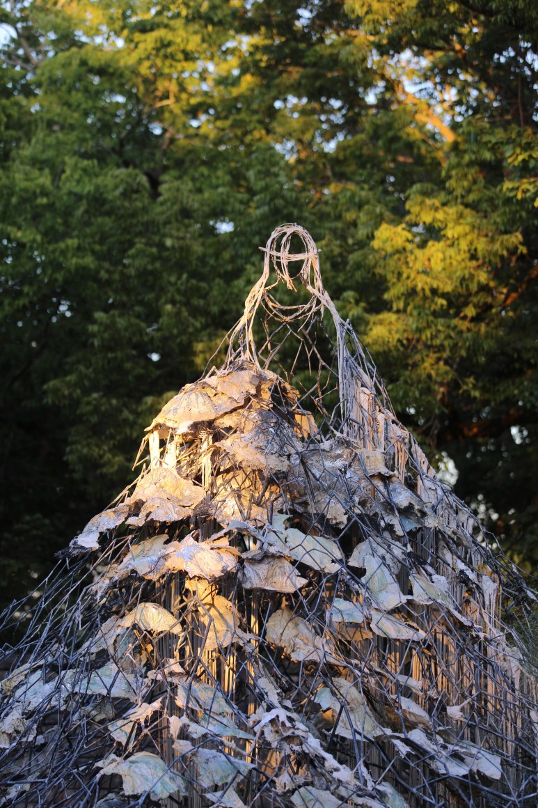 “Al-Hadid has created the constraining environment as permeable, made of slender sticks and leaflike attachments. Full of gaps and holes, this structure seems now part mountain and part clothing, and in either case too insubstantial to hold the woman in or keep the world out.”