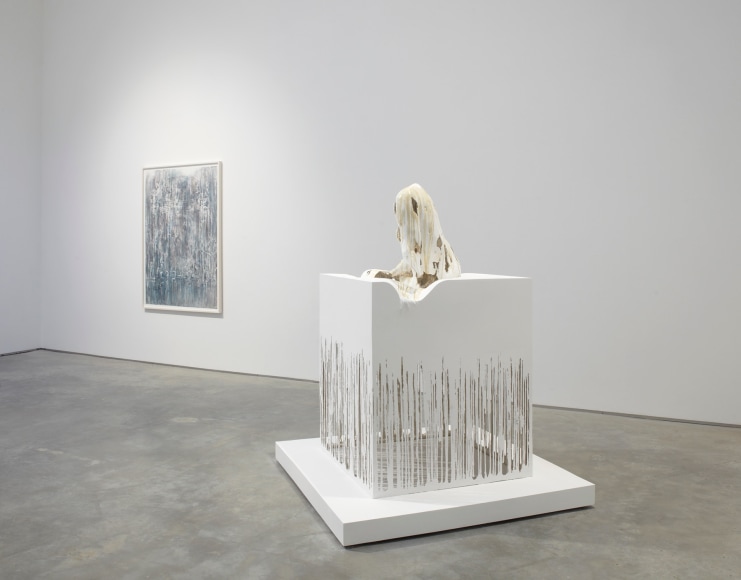 This contradiction carries through to her figures, which frequently appear halted in a state of transition, from solid to liquid as in the melting woman of In Mortal Repose, 2011 or dissolving into the stairs as in the sinking man of Suspended After Image. In the latter, the largest scale work of the show, Al-Hadid takes the detail of a robe from a 15th Century painting of The Visitation by an unknown artist in the collection of The Prado as her point of departure. As its title suggests, the 500-year-old image traverses time and imprints itself in the memory.